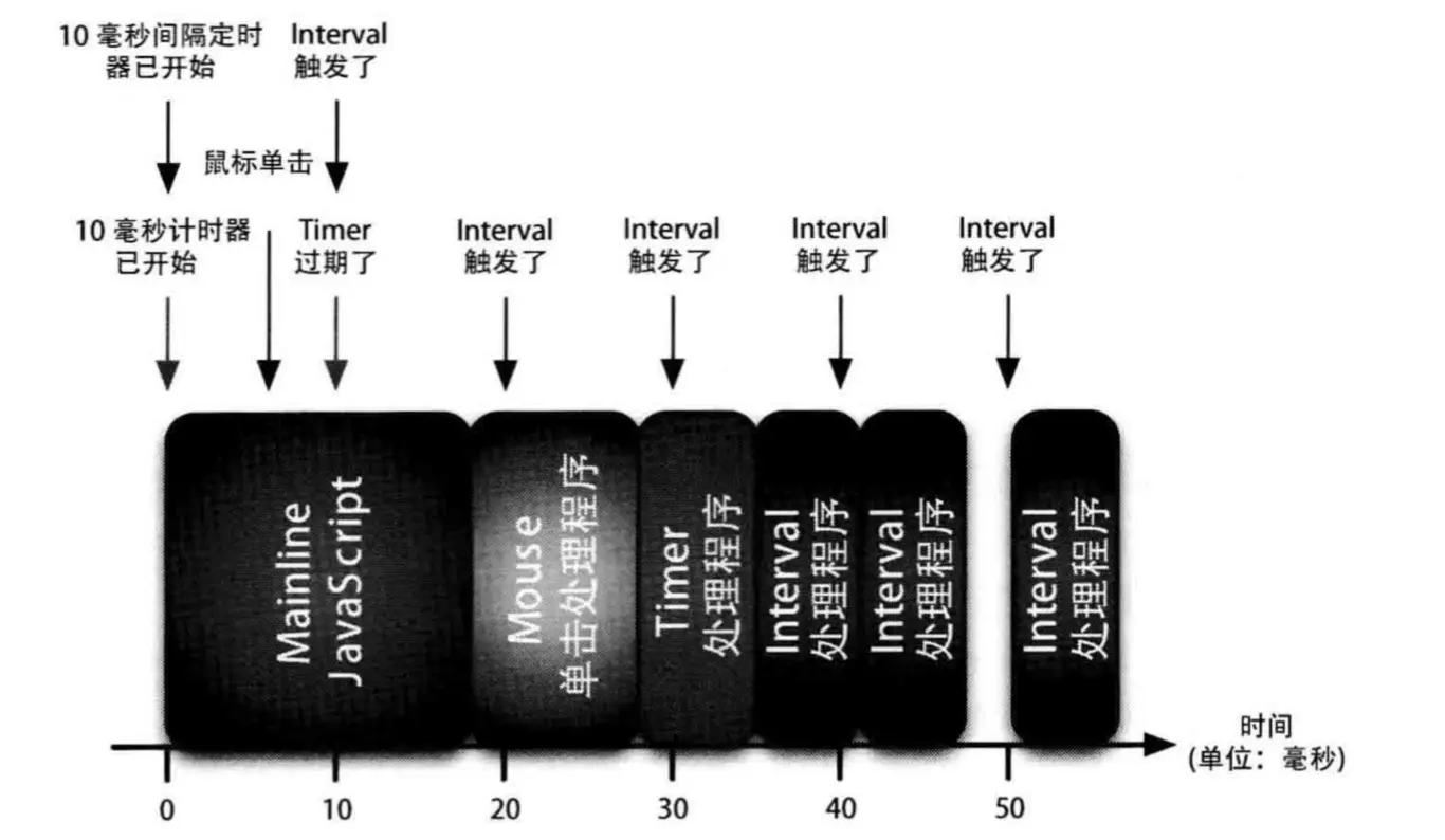 18ms时,主线程执行完毕,开始执行队列里面的事件,队列里面现在有鼠标单击事件、setTimeout定时器和setInterval定时器。20ms时,由于队列里面有setInterval定时器,所以第二个到期的间隔定时器就会作废处理。28ms时,单击事件执行完成,并且在10ms就应该执行的setTimeout定时器,现在才开始执行。30ms时,第三个setInterval定时器到期,因队列中有间隔定时器,所以第三个也作废。34ms时,setTimeout定时器执行完成,开始执行setInterval,但由于第一个间隔定时器在42ms时结束,所以40ms时,到期的第二个间隔定时器,又要进行排队等待。47ms时,由于第二个setInterval可以在第三个间隔定时器50ms到期时执行完,所以不需要排队直接执行。