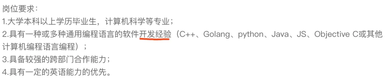 我随手查阅了一些企业的校招要求,里面明确要求要有一定的项目经验。这就意味着如果没有项目经验,就无法找到工作;找不到工作,就不会有项目经验。好像是一个死结唉。