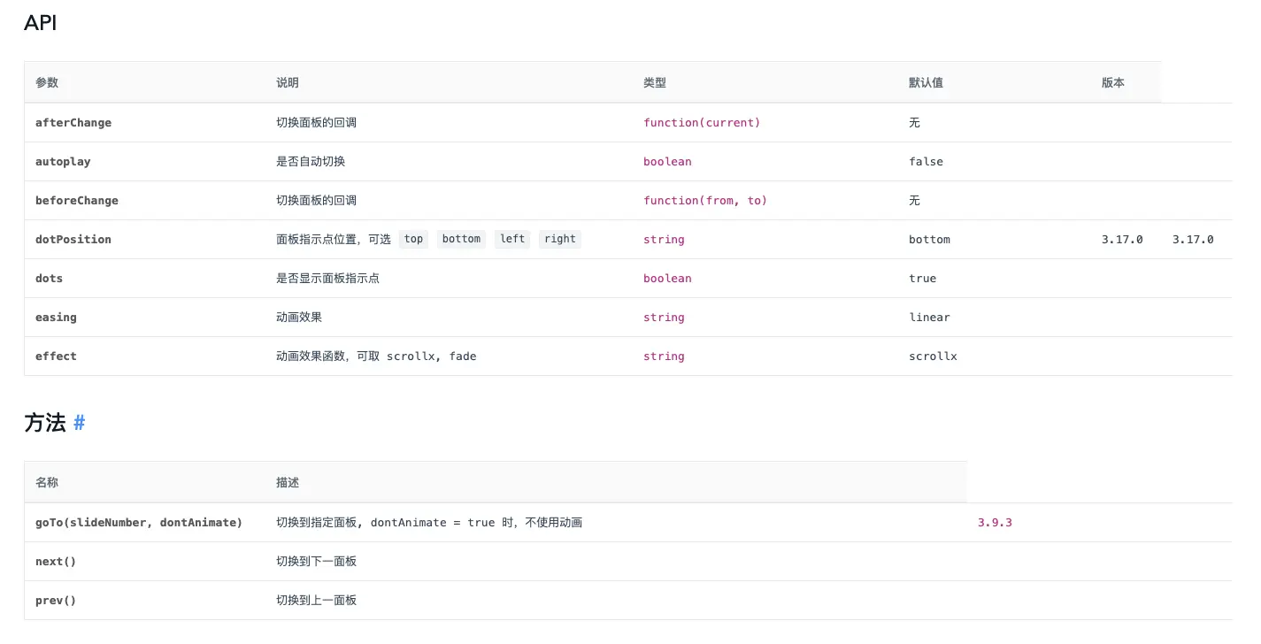 Antd的轮播组件叫Carousel(走马灯),正常的轮播组件都有给出轮播间隔和轮播速度的轮播配置例如Swiper,可Antd的轮播配置却显得异为简单: