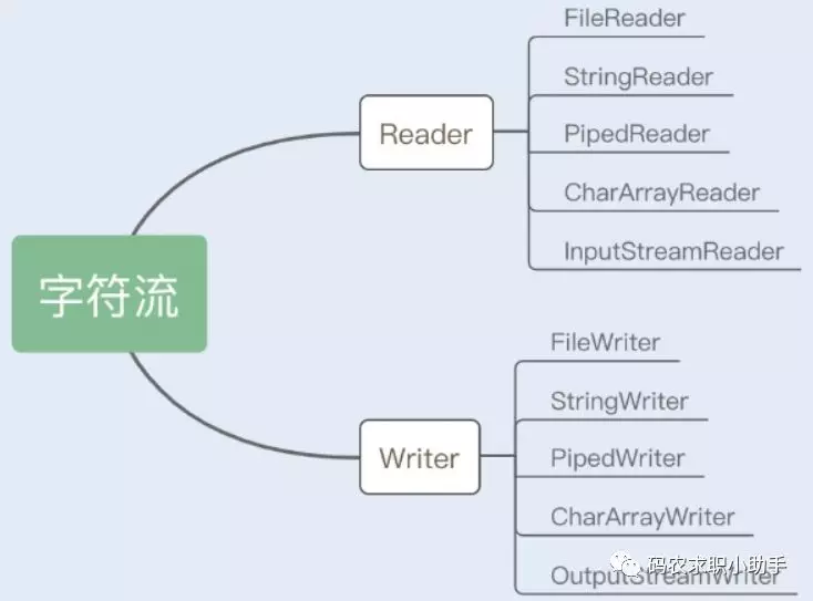 字符流:Reader/Writer 是字符的抽象类,这两个抽象类也派生了若干子类,不同的子类分别处理不同的操作类型。