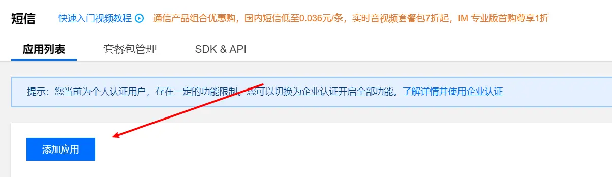 在开通完成后,点击界面中的【添加应用】,添加一个新的短信应用,你可以根据自己的实际情况,添加短信应用的名称和简介。