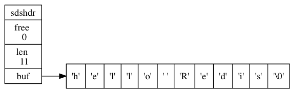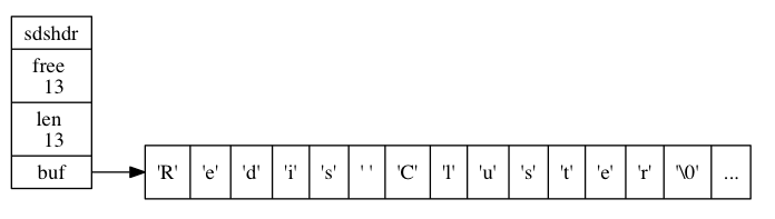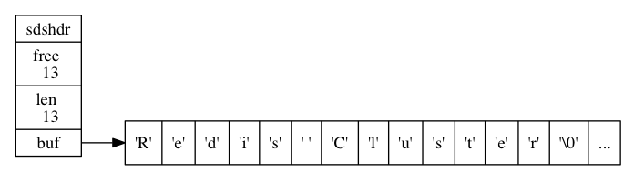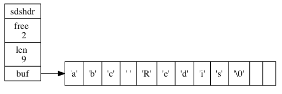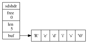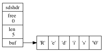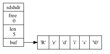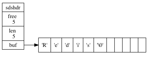 free 属性的值为 0 , 表示这个 SDS 没有分配任何未使用空间。 len 属性的值为 5 , 表示这个 SDS 保存了一个五字节长的字符串。 buf 属性是一个 char 类型的数组, 数组的前五个字节分别保存了 'R' 、 'e' 、 'd' 、 'i' 、 's' 五个字符, 而最后一个字节则保存了空字符 '\0'