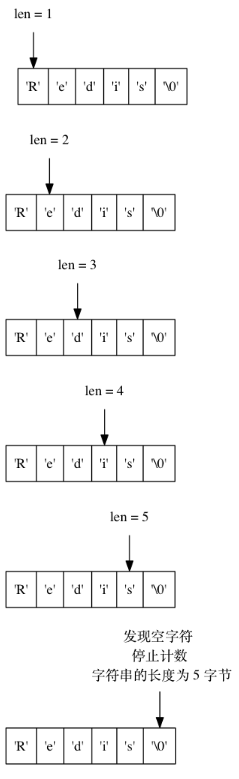 比如说, 下图就展示了一个值为 "Redis" 的 C 字符串:
