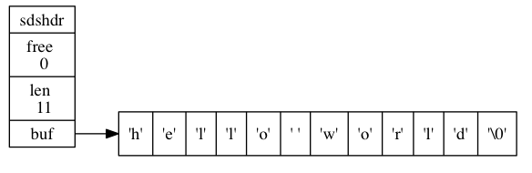 又比如说, 对于下图 展示的 SDS 来说, 程序只要访问 SDS 的 len 属性, 就可以立即知道 SDS 的长度为 11 字节。