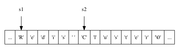 举个例子, 假设程序里有两个在内存中紧邻着的 C 字符串 s1 和 s2 , 其中 s1 保存了字符串 "Redis" , 而 s2 则保存了字符串 "MongoDB", 如下图 所示。