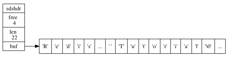来打印出 SDS 保存的字符串值 "Redis" , 而无须为 SDS 编写专门的打印函数。