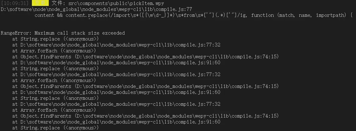 在wepy中写了一个组件,但是每次保存该组件的时候,都会报栈溢出错误,如下图。此组件相当简单,甚至没有data、prop、components、methods等,所以对于报这个错误很是纳闷。毕竟网上一片言论,栈溢出多和死循环相关。
