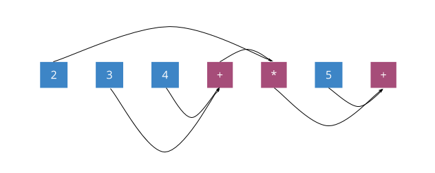 由于数学上习惯写法是中序遍历,我们通常要加上括号消除歧义(比如加减和乘除的顺序)。通过把操作符后移 我们得到 RPN:2 3 4 + * 5 +,这样我们无需括号就能无歧义地遍历这个表达式: