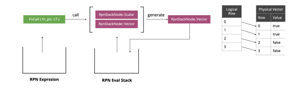 实现表达式函数(FnCall)是比较繁琐的。比如对于二元操作符加法, 它既可以接受其中一元输入常量,也可以接受来自列数据的向量。一种解决方法是将标量都重复填充为向量,这样所有函数运算都是向量参数,但这个方法会有额外的标量拷贝开销。为了避免这个开销,Coprocessor 直接实现了向量与标量的运算,rpn_expr_codegen 提供了过程宏 #[rpn_fn] ,我们只需定义标量逻辑,过程宏将自动生成剩下带有向量的逻辑。