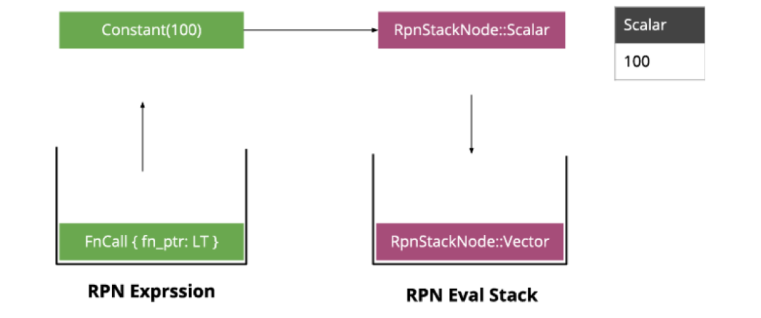 注意,Coprocessor 中表达式是向量化计算的,每次都尽量会计算多行,通常为 1024 行,即 op([]value, []value) 而不是 op(value, value),从而减少分支并提高 Cache Locality。但运算数并不总是一个来自列的向量,还可能是用户直接指定的常量(例如 SELECT a+1 中 a 是向量,但 1 只是标量)。因此,RpnStackNode 分两种: