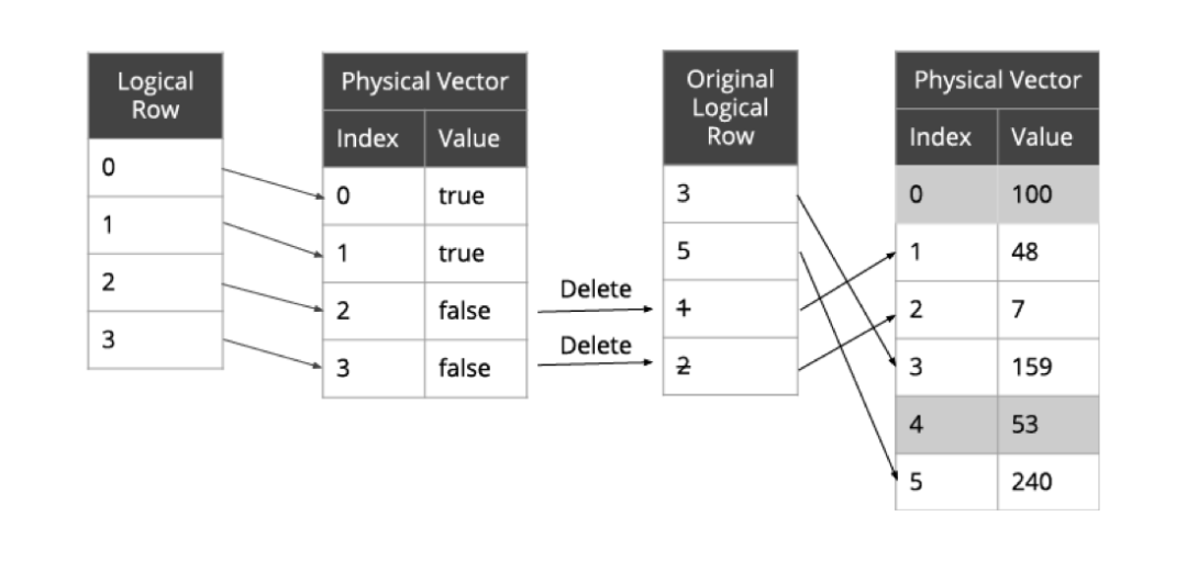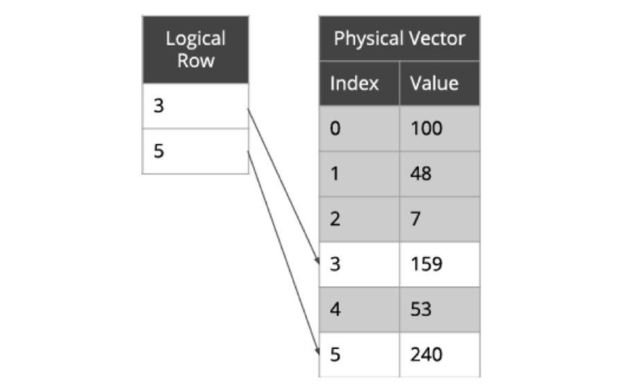 另外为了避免 Selection 算子移动大量的数据,向量使用了间接的储存方式,每个向量有真实数据和逻辑索引,只有逻辑索引中对应的真实数据才是逻辑有效的,这样 Selection 算子便可以只需改动逻辑索引而不需搬动大量的真实数据:
