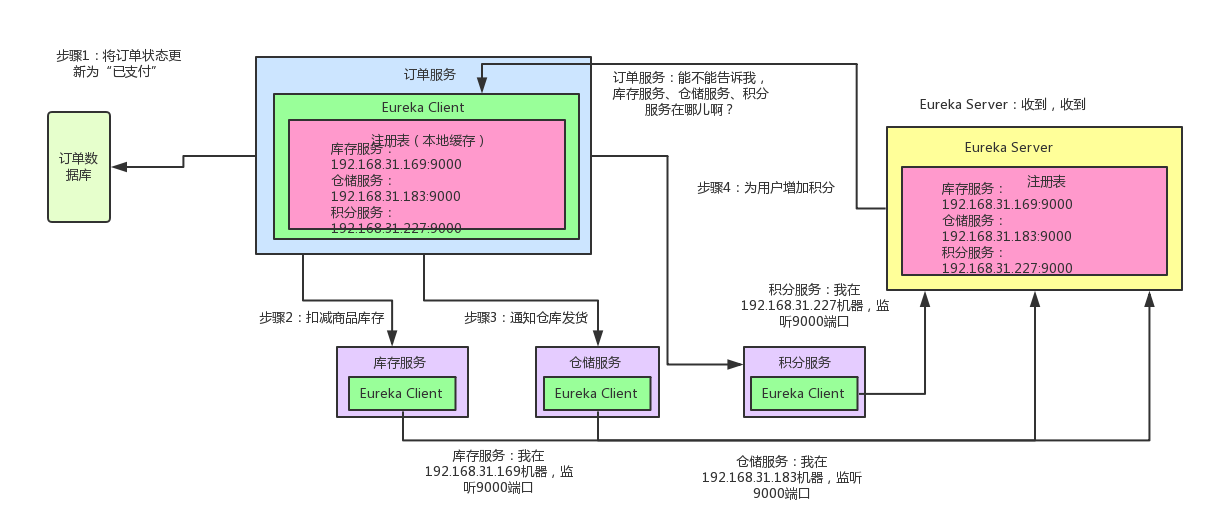 订单服务里也有一个Eureka Client组件,这个Eureka Client组件会找Eureka Server问一下:库存服务在哪台机器啊?监听着哪个端口啊?仓储服务呢?积分服务呢?然后就可以把这些相关信息从Eureka Server的注册表中拉取到自己本地缓存起来。