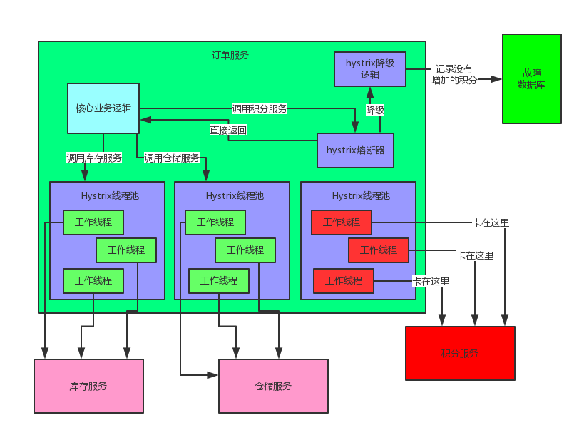 在微服务架构里,一个系统会有很多的服务。以本文的业务场景为例:订单服务在一个业务流程里需要调用三个服务。现在假设订单服务自己最多只有100个线程可以处理请求,然后呢,积分服务不幸的挂了,每次订单服务调用积分服务的时候,都会卡住几秒钟,然后抛出—个超时异常。