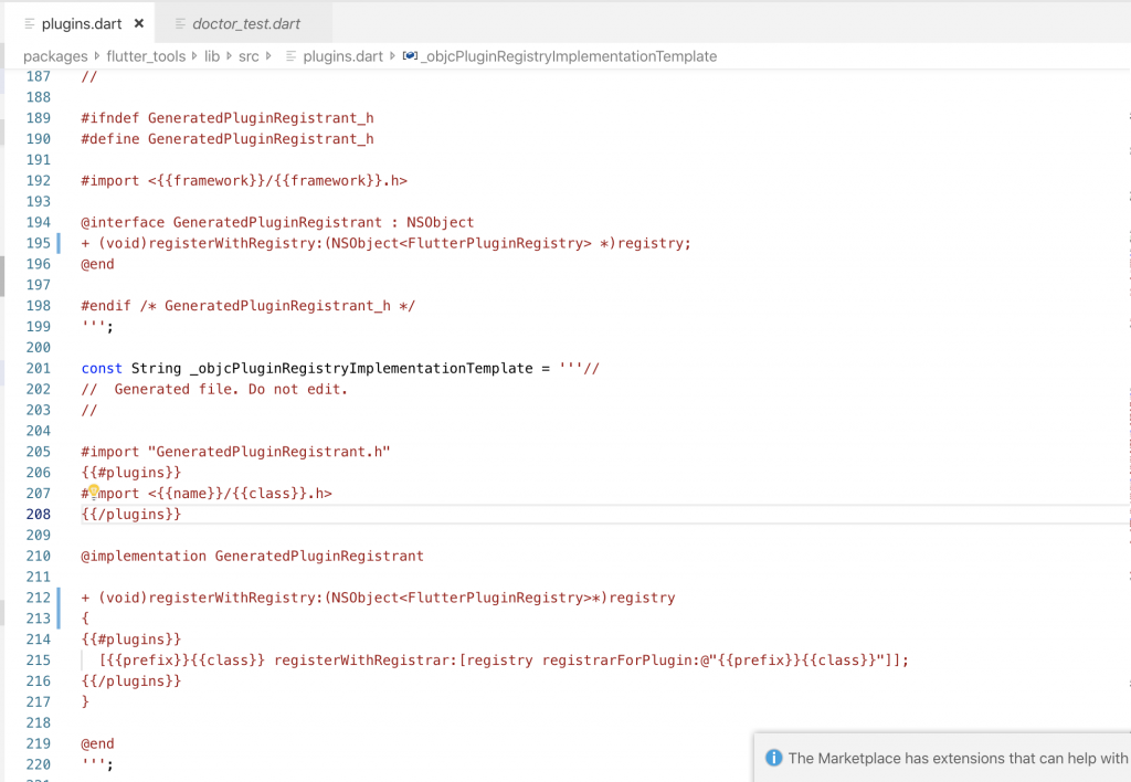 如何修改flutter命令生成的文件默认格式呢,想到这里其实问题基本上可以解决了,我们把flutter安装目录及其子目录都拉到vscode中,全局搜索`@implementation GeneratedPluginRegistrant` 则可以得到模板文件。路径如下。