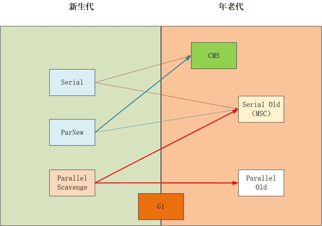 在详细讨论具体垃圾收集器之前,我们先看下这些收集器所适用的范围,以及它们的组合配对关系。