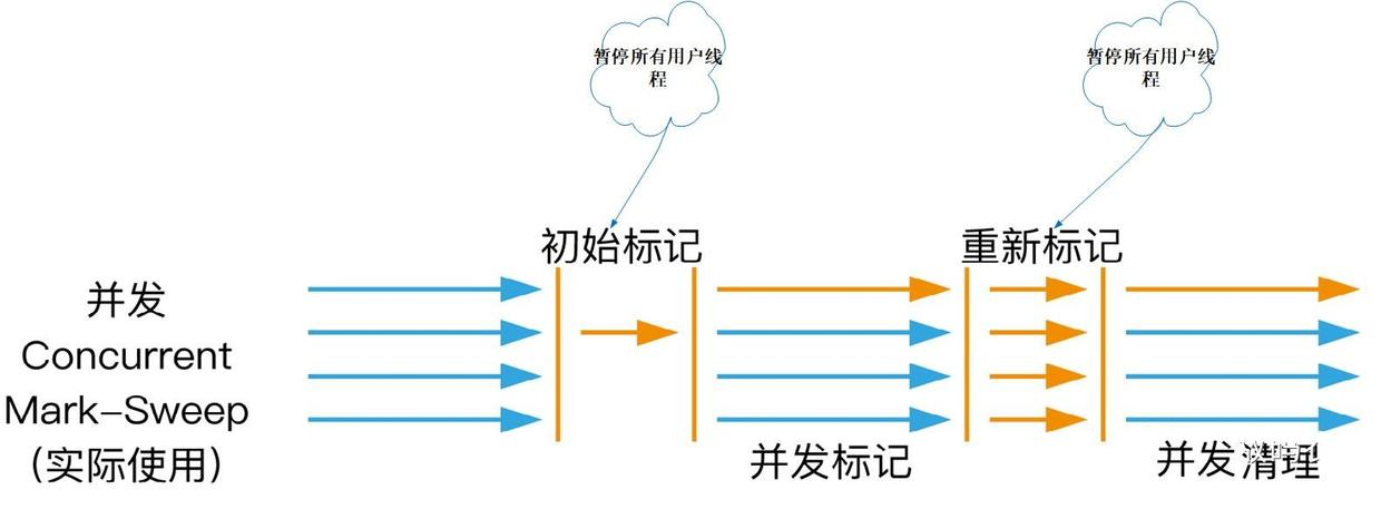 CMS(Concurrent Mark-Sweep)是一款以获取最短回收停顿时间为目标的收集器。比较适合互联网响应式应用场景,采用的是**“标记-清除”**算法。