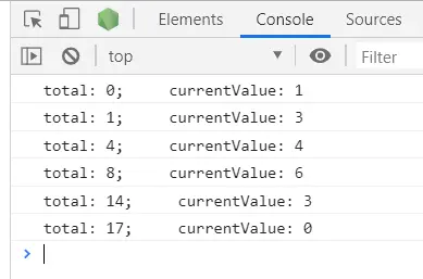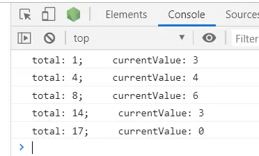 console.log('total: ' + total + '; currentValue: ' + currentValue)