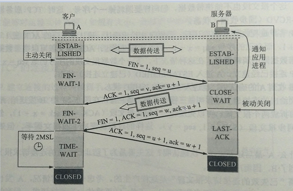 客户端发送了一个释放连接的报文FIN=1,指定了报文的序列号seq=u,并且停止再发送数据,主动关闭TCP连接,进入FIN_WAIT1终止等待1状态,等待服务器的确认。