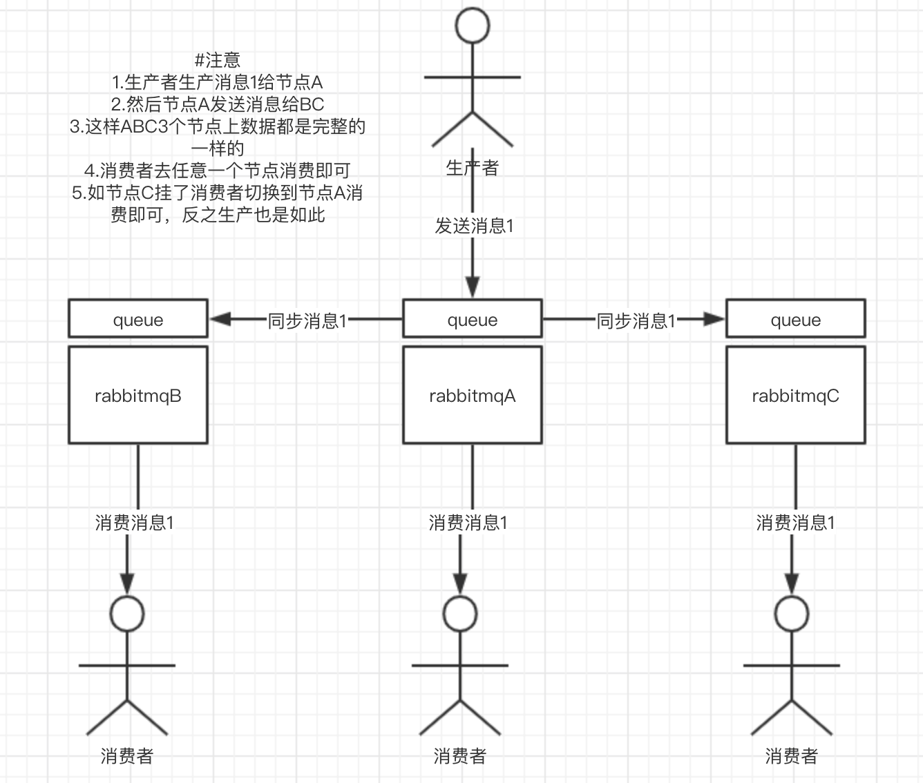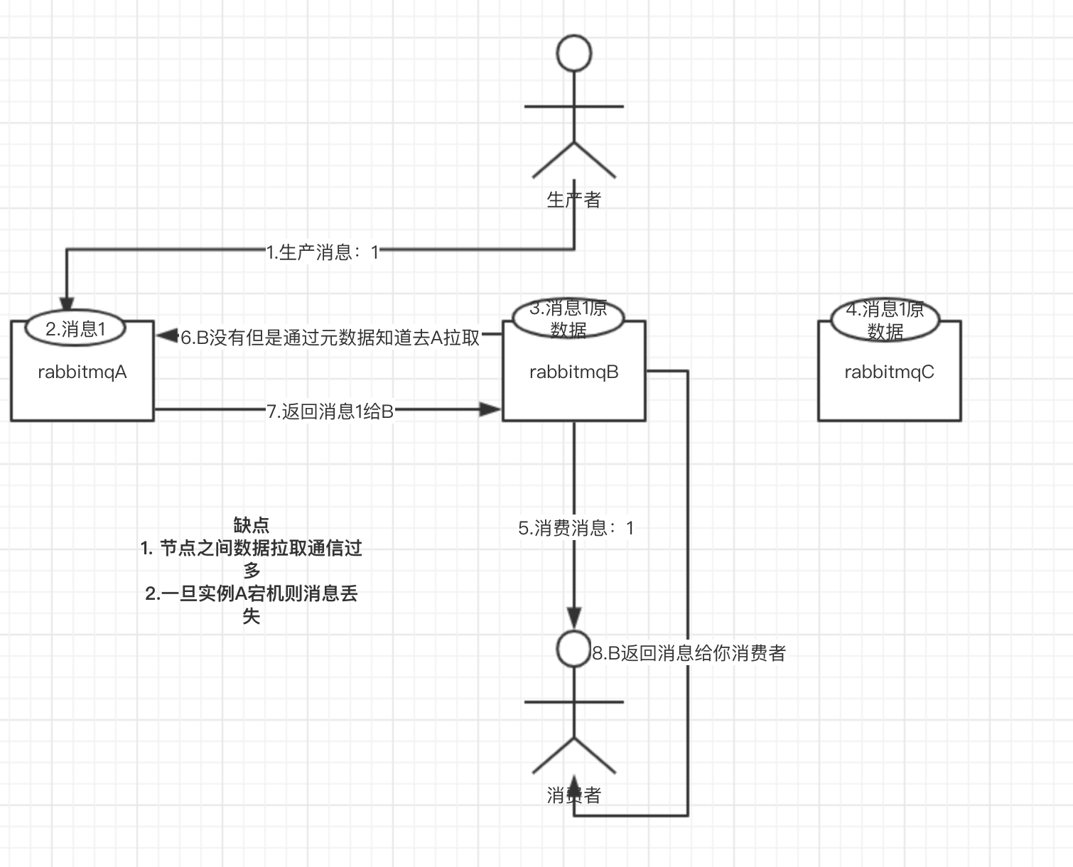普通集群模式,有服务器ABC,在服务器ABC上分别启动RabbitMQ实例,生产者生产消息1,随机发给某一实例A,实例BC上记录消息1的原数据信息(比如消息1具体信息在示例A上),消费者消费消息,随机连接某个示例B,消费消息1,实例B根据原数据发现消息1在实例A上,则实例B去实例A拉取消息返回给消费者。