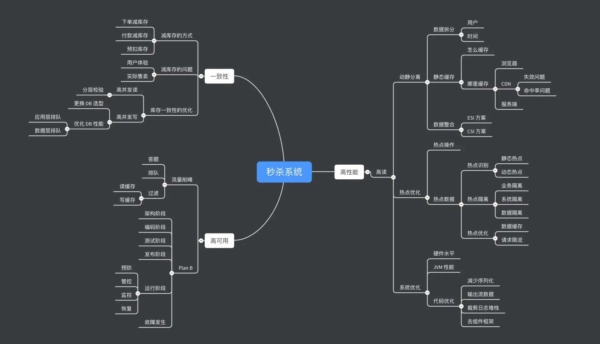 首先从高维度出发,整体思考问题。秒杀无外乎解决两个核心问题,一是并发读,一是并发写,对应到架构设计,就是高可用、一致性和高性能的要求。关于秒杀系统的设计思考,本文即基于此 3 层依次推进,简述如下——