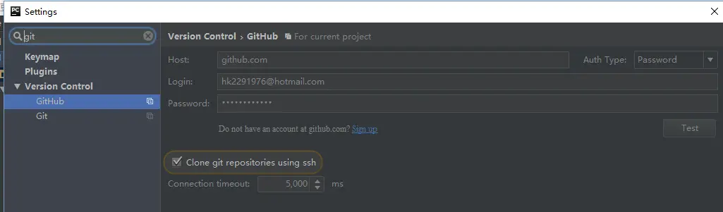 如上面图所示,搜索框会出现github,然后在旁边输入你github的用户名和密码,可以点击”test”测试一下,如果出现:Connection successful 说明连接成功。(注意!!!这里using ssh最好不选,否则出现很多提交不了的问题),然后点击的Apply,就完成了。