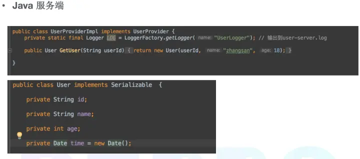 上图是一个简单的 java service ,注册为一个 Dubbo 服务,是一个简单的获取用户信息的例子。