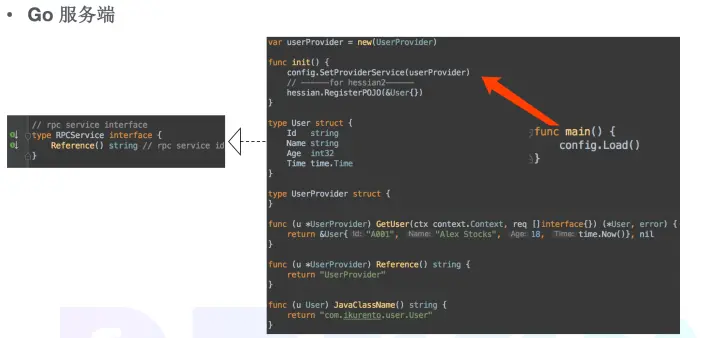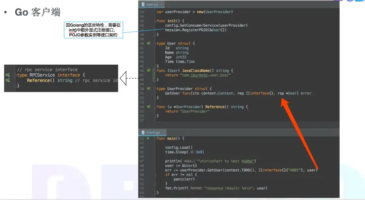 上图是 dubbo-go 的客户端,来订阅和调用这个 Java 的 Dubbo 服务。Go 语言客户端需要显式调用 SetConsumerService 来注册需要订阅的服务,然后通过调用 dubbo-go-hessian2 库的 registerPOJO 方法来注册 user 对象,做 Java 和 Go 语言之间的自定义 pojo 类型转换。具体的服务调用方法就是声明一个的 GetUser 闭包,便可直接调用。