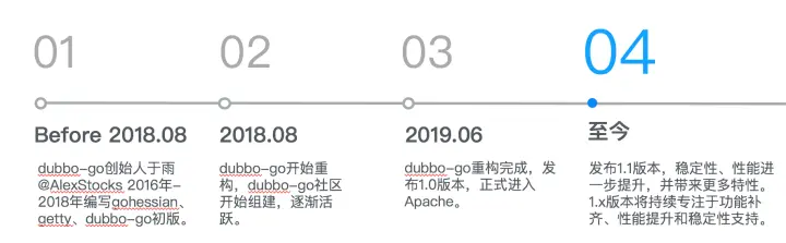 后来我们将重构后的版本 dubbo-go 1.0 贡献给 Apache 基金会,到现在已经过去了两个多月的时间,近期社区发布了1.1版本。目前为止,已经有包括携程在内的公司已经在生产环境开始了试用和推广。