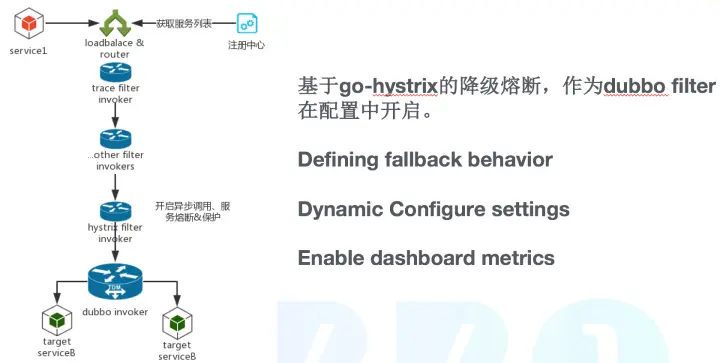 降级熔断这边是基于的是大家比较熟悉的 hystrix 的 Go 语言版本,基于 hystrix ,用户可以定义熔断规则和降级触发的代码段。降级熔断支持是作为一个独立的 dubbo-go filter ,可以灵活选择是否启用,如果不启用就可以在打包的时候不将依赖引入。Filter 层是 dubbo-go 中对于请求链路的一个责任链模式抽象,目前有许多功能都是基于动态扩展 filter 链来实现的,包括 trace、leastactive load balacne、log 等。降级熔断设计成一个服务调用端独立的filter可以灵活满足调用端视角对于微服务架构中“防雪崩“的服务治理需求。