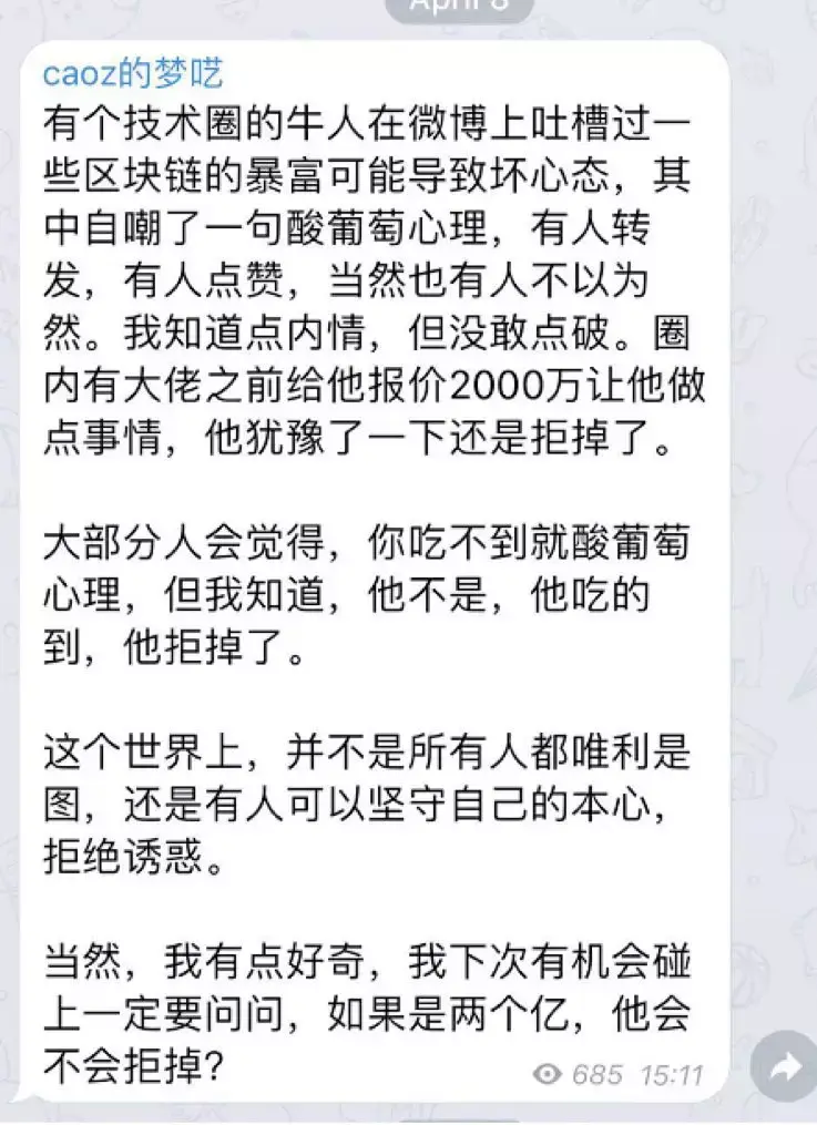融资过程中,有好些投资人都有点不太相信我们,只有8个人,还全是工程师,没有销售,第一年还盈利了,感觉像是来骗投资的。 其间有个插曲,有个币圈的大佬想要投资我们,也希望我能为他们提供技术支持,后来,我还是谢绝了,主要还是感觉不在一个方向上。我还曾经发微博自嘲过自己的 “酸葡萄心理”。后来,曹政(caoz的梦呓)在他的电报群里提到过这个事,让我着实惊讶,这个世界真是没有秘密。