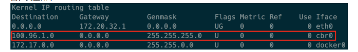 - 因此数据包到达了node2的主网络接口eth0。现在即使pod4不是eth0的IP,数据包也仍然能转发到cbr0,因为节点配置了IP forwarding enabled。节点的路由表寻找任意能匹配pod4 IP的路由。它发现了 cbr0 是这个节点的CIDR块的目标地址。你可以用route -n命令列出该节点的路由表,它会显示cbr0的路由,类型如下: