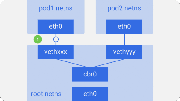 类似的,每个Pod都有其自身的netns(network namespace),通过一个虚拟的以太网对连接到root netns。这基本上就是一个管道对,一端在root netns内,另一端在Pod的netns内。