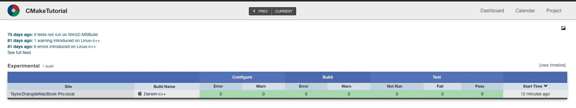 ctest 将构建和测试项目,并将结果提交给Kitware公共仪表板。仪表板的结果将被上传到Kitware的公共仪表板:my.cdash.org/index.php?p…,如下图所示: