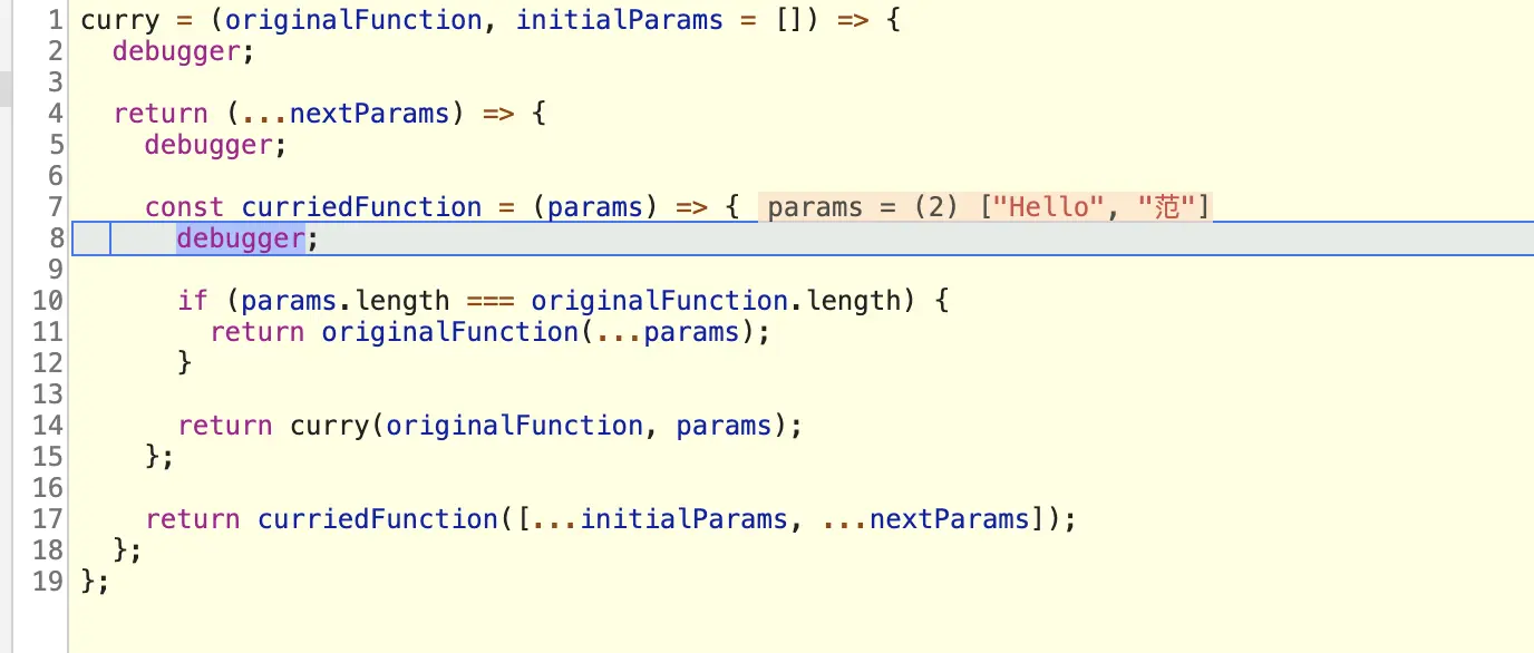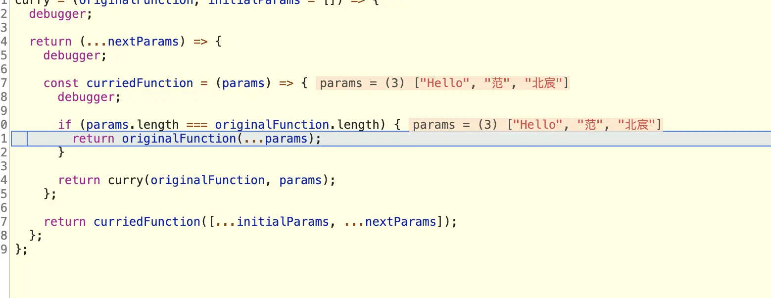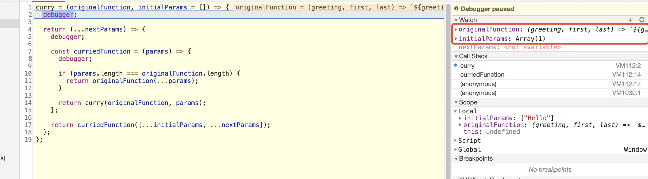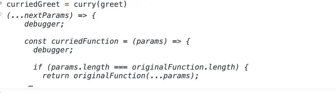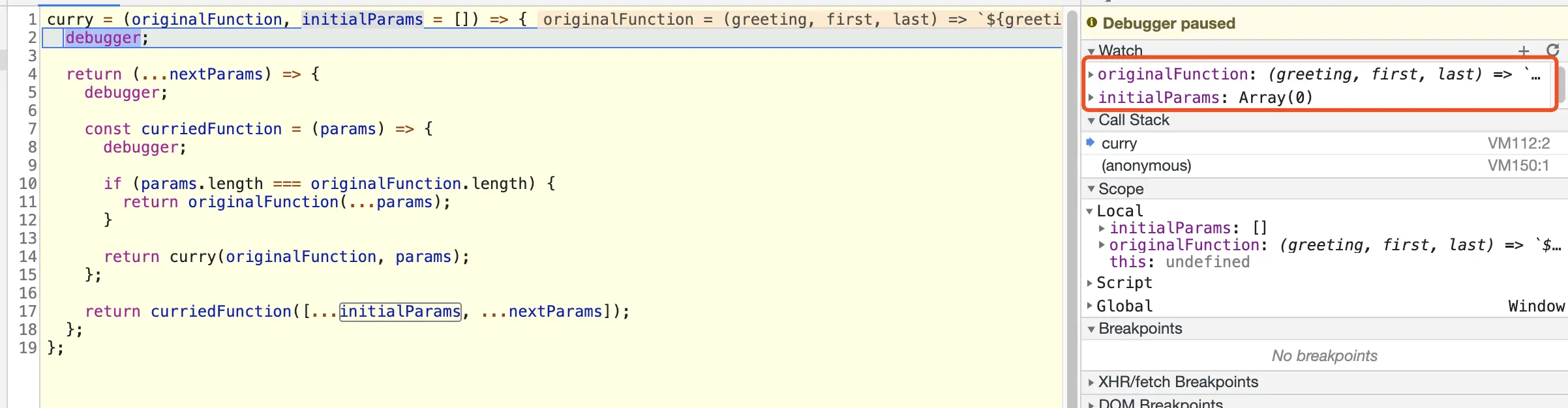 originalFunction和initialParams。但是在第一次断点之后,就返回了一个新函数,为什么在新函数的作用域中,也可以访问到这些变量呢?这是因为该新函数是从父级函数中返回的,能够访问父级函数中定义变量。(或者用更加通俗的话来讲,这是闭包,关于闭包,会专门有一篇文章,进行讲解,现在在筹备过程中。敬请期待)