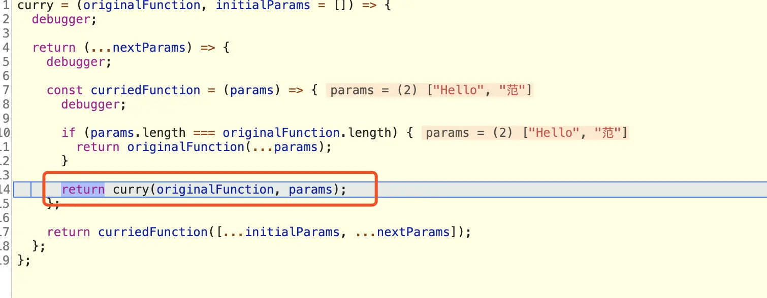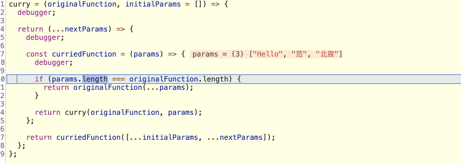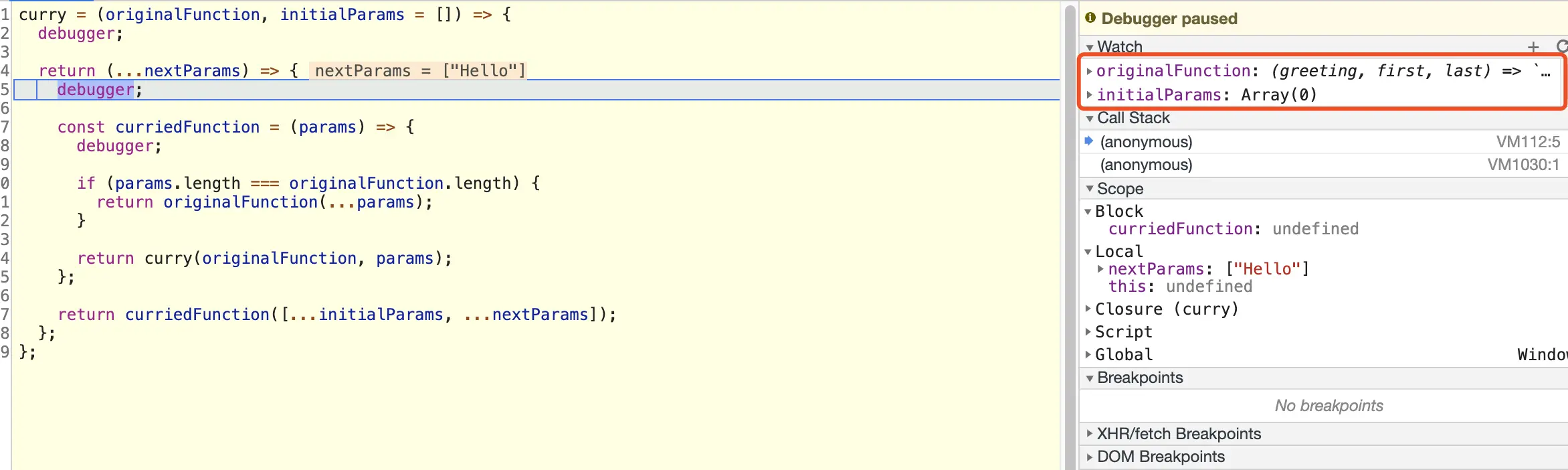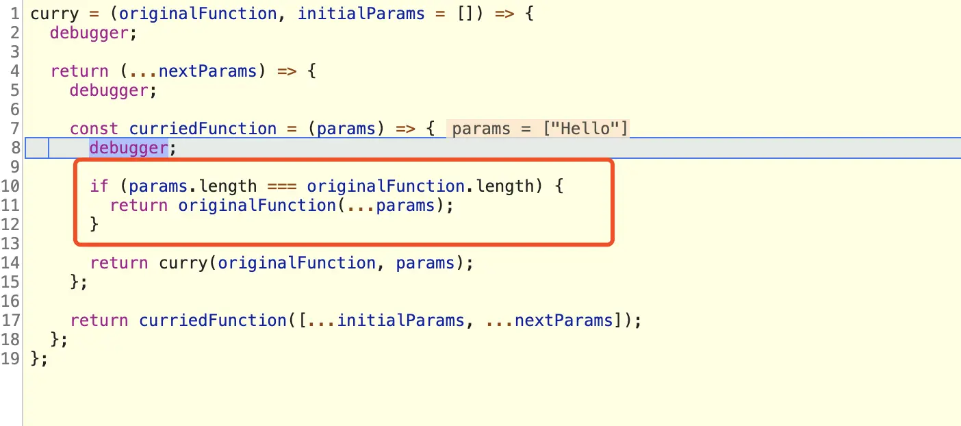 originalFunction和initialParams。但是在第一次断点之后,就返回了一个新函数,为什么在新函数的作用域中,也可以访问到这些变量呢?这是因为该新函数是从父级函数中返回的,能够访问父级函数中定义变量。(或者用更加通俗的话来讲,这是闭包,关于闭包,会专门有一篇文章,进行讲解,现在在筹备过程中。敬请期待)