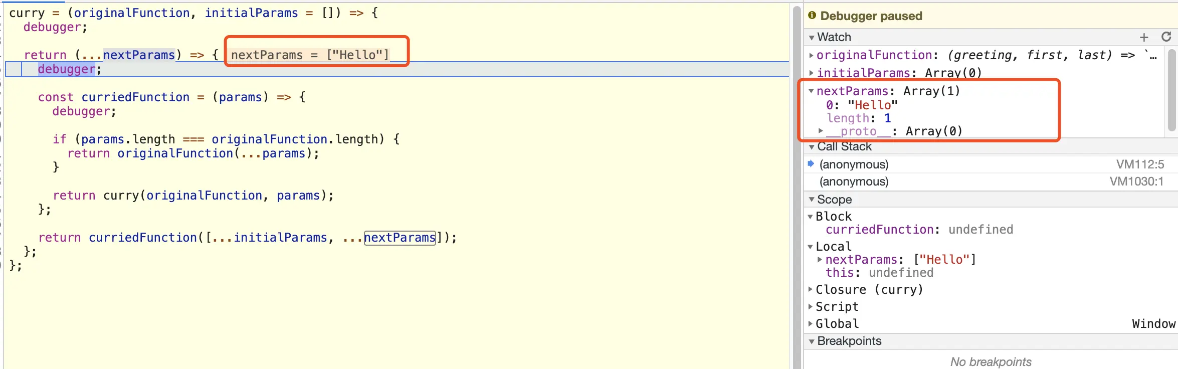 通过监听nextParams我们忽然发现,该值为['Hello']。但是我们在调用curriedGreet()的时候,是传入的'Hello'而不是['Hello']。