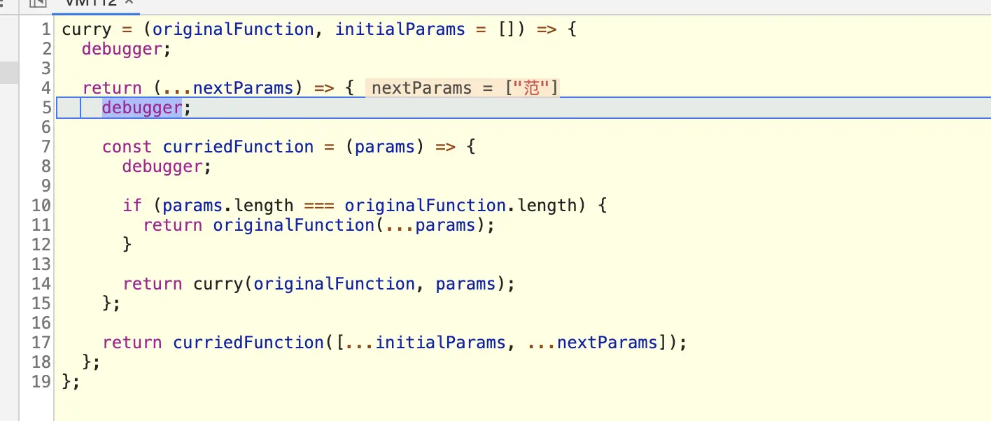在运行第六行的debugger之前,是先调用12行的。我们在第五行定义了一个名为curriedFunction的函数,在12行处调用他。所以我们将断点放置在了方法体内。那调用curriedFunction的时候,传入的数据是啥呢?