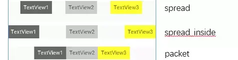 一条链的第一个控件是这条链的链头,我们可以在链头中设置 layout_constraintHorizontal_chainStyle来改变整条链的样式。chains提供了3种样式,分别是: CHAIN_SPREAD —— 展开元素 (默认); CHAIN_SPREAD_INSIDE —— 展开元素,但链的两端贴近parent; CHAIN_PACKED —— 链的元素将被打包在一起。 如图所示:
