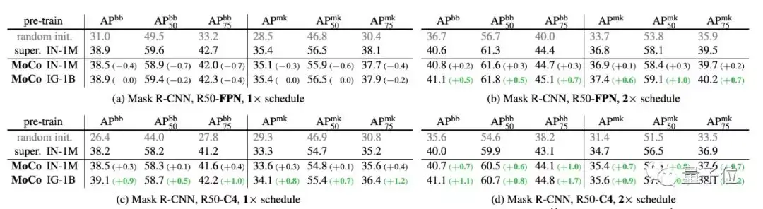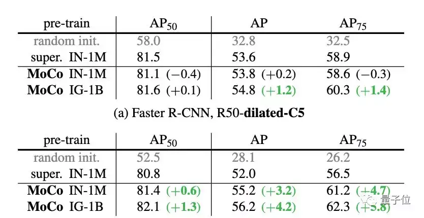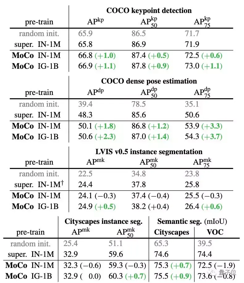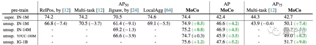 在ImageNet、CoCo等数据集上,MoCo甚至在某些情况下大大超越了监督预训练模型。