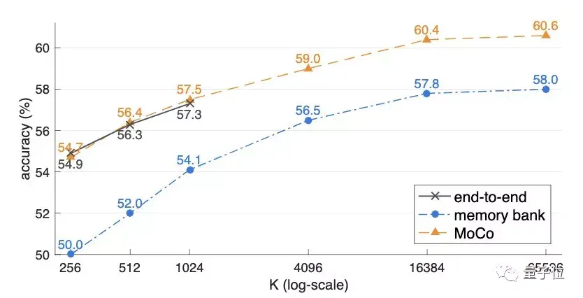 而memory bank的准确率则始终比MoCo低了2%以上。