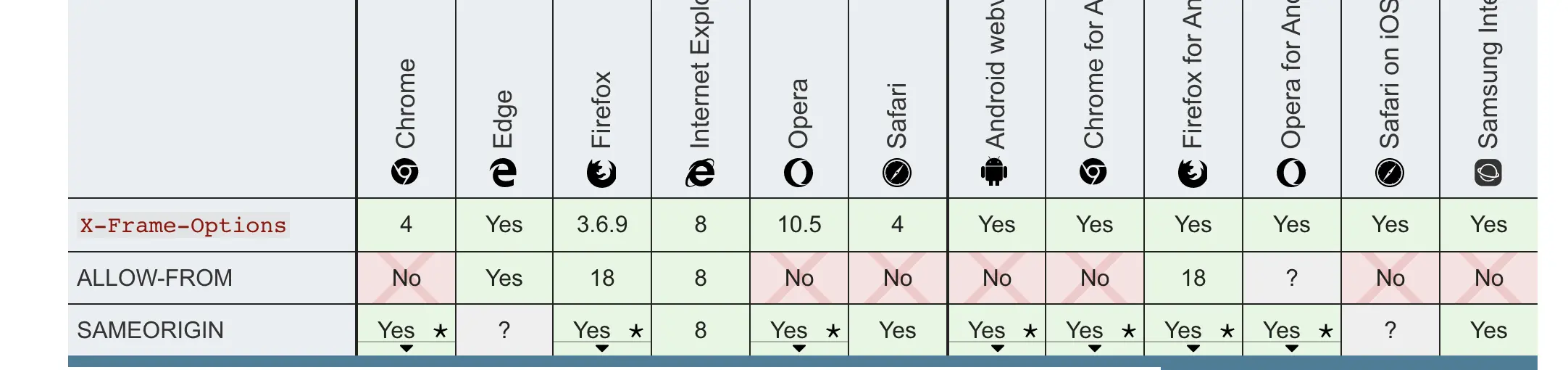 由于ALLOW-FROM的兼容性chrome、safari都不支持,建议不用,DENY和 SAMEORIGIN 兼容性还可以,可以按需使用。
