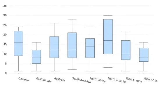 显示同一维度上值的上限和下限之间的差异。 使用图形的大小和位置表示数值的上限和下限,通常用于表示数据在某一个分类(时间点)上的最大值和最小值。