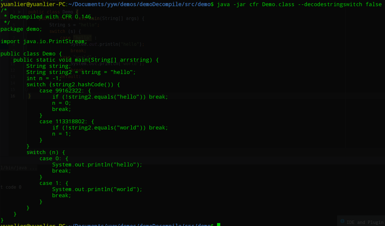 可以看到,对字符串的 switch 支持其实是通过 hashCode() 和 equals() 实现的。值得注意的是,这里用 equals() 进行了必要的二次校验,这是为了防止哈希碰撞,即哈希码相同而对象不同的情况。