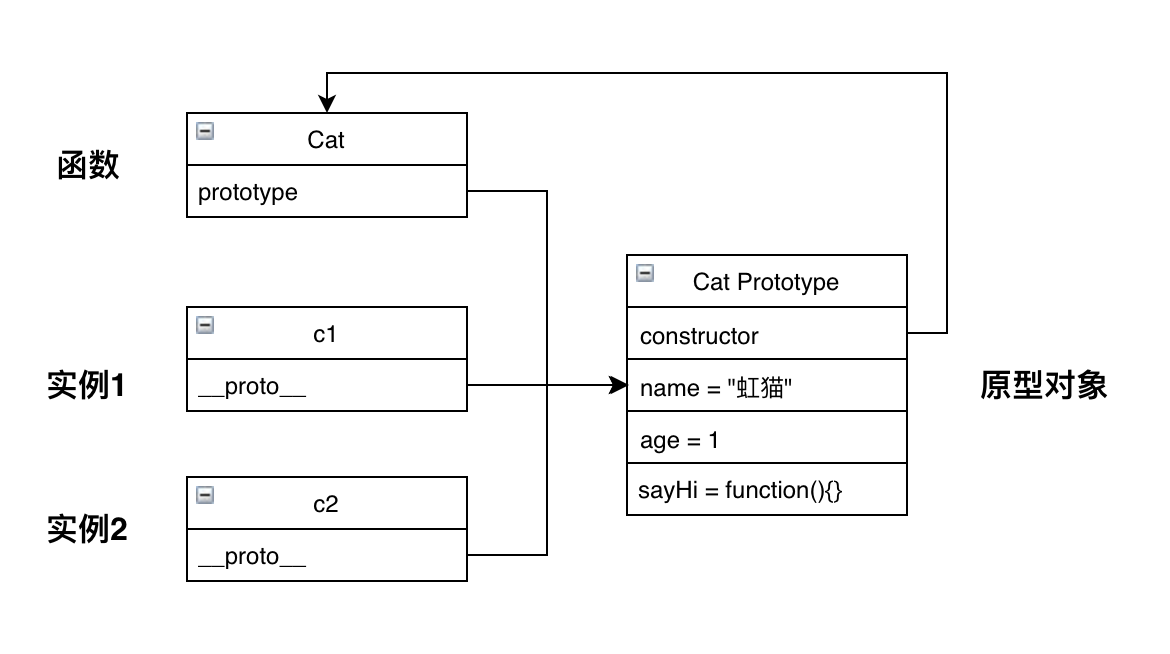 为了方便理解对象、原型对象、实例之间的关系,整理一个简单的图如下,还以Cat为例: