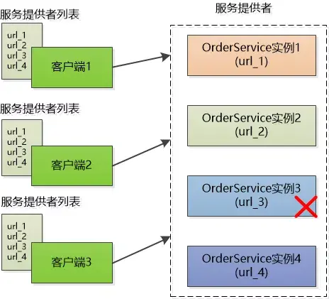 张大胖一看这个图就明白怎么回事了,为了支持高并发,OrderService被部署了4份,每个客户端都保存了一份服务提供者的列表,但是这个列表是静态的(在配置文件中写死的),如果服务的提供者发生了变化,例如有些机器down了,或者又新增了OrderService的实例,客户端根本不知道,可能还在傻乎乎地尝试那些已经坏掉的实例呢!