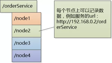 /orderService 表达了一个服务的概念, 下面的每个节点表示了一个服务的实例。 例如/orderService/node2表示的order service 的第二个实例, 每个节点上可以记录下该实例的url , 这样就可以查询了。