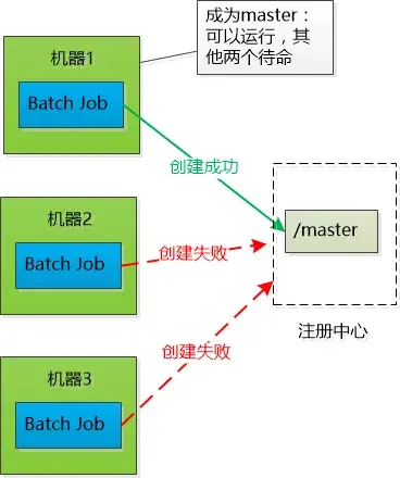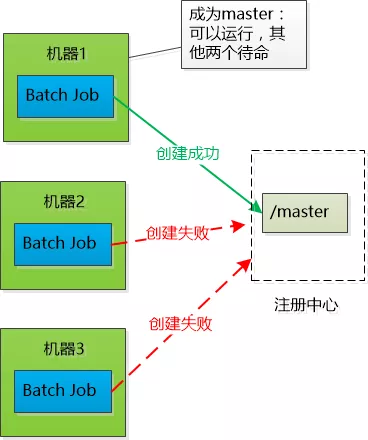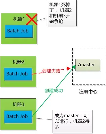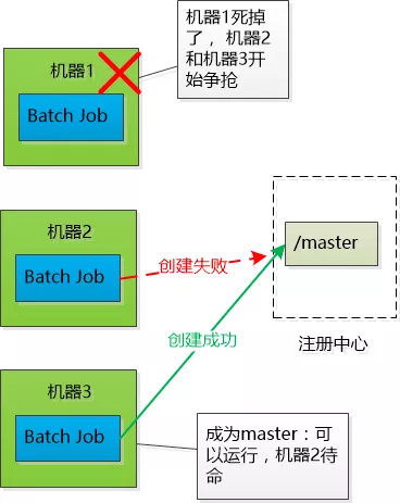 其实不是吼一声,三个Batch Job启动以后,都去注册中心争抢着去创建一个树的节点(例如/master ),谁创建成功谁就是Master (当然注册中心必须保证只能创建成功一次,其他请求就失败了),其他两个Batch Job就对这个节点虎视眈眈地监控,如果这个节点被删除,就开始新一轮争抢,去创建那个/master节点。