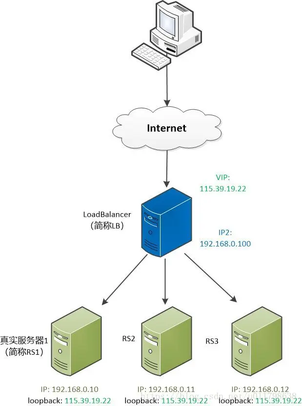Load Balancer 简称LB , 有两个IP,一个对外(115.39.19.22),一个对内(192.168.0.100)。用户看到的是那个对外的IP。 后面的真正提供服务的服务器有三个,称为RS1, RS2,RS3, 他们的网关都指向LB。