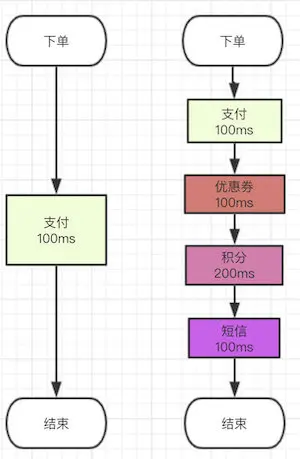那链路长了就慢了,但是我们发现上面的流程其实可以同时做的呀,你支付成功后,我去校验优惠券的同时我可以去增减积分啊,还可以同时发个短信啊。