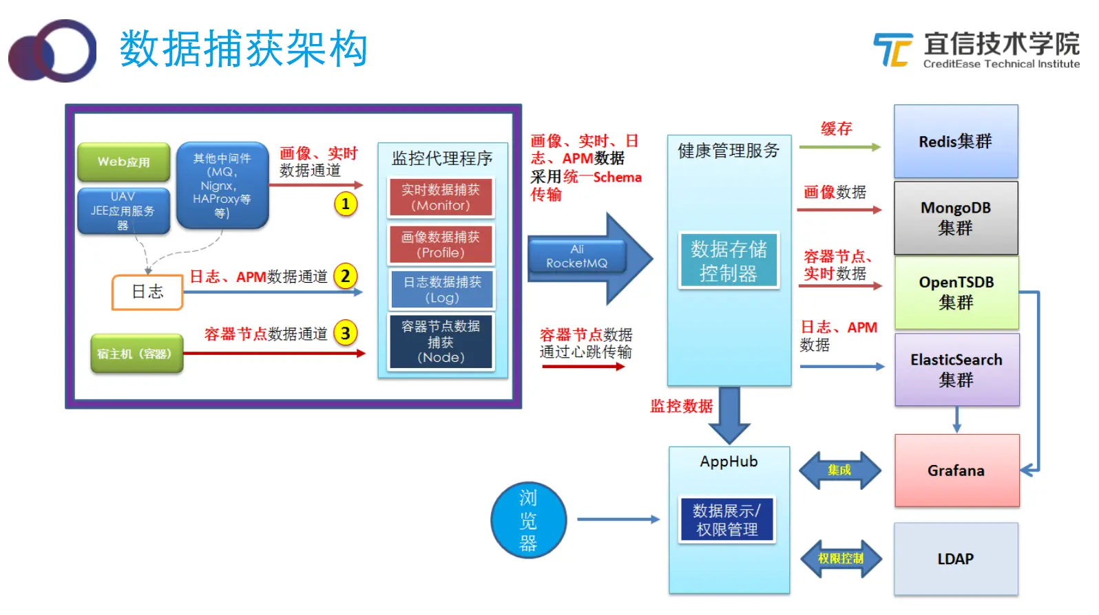 - MQ传输通道,用来传输应用相关的监控数据,主要包括:应用实时数据,画像数据,日志数据,以及调用链和JVM线程栈等APM数据。MQ数据传输通道上的数据格式采用了统一的Schema,方便后期对数据的转换和处理。